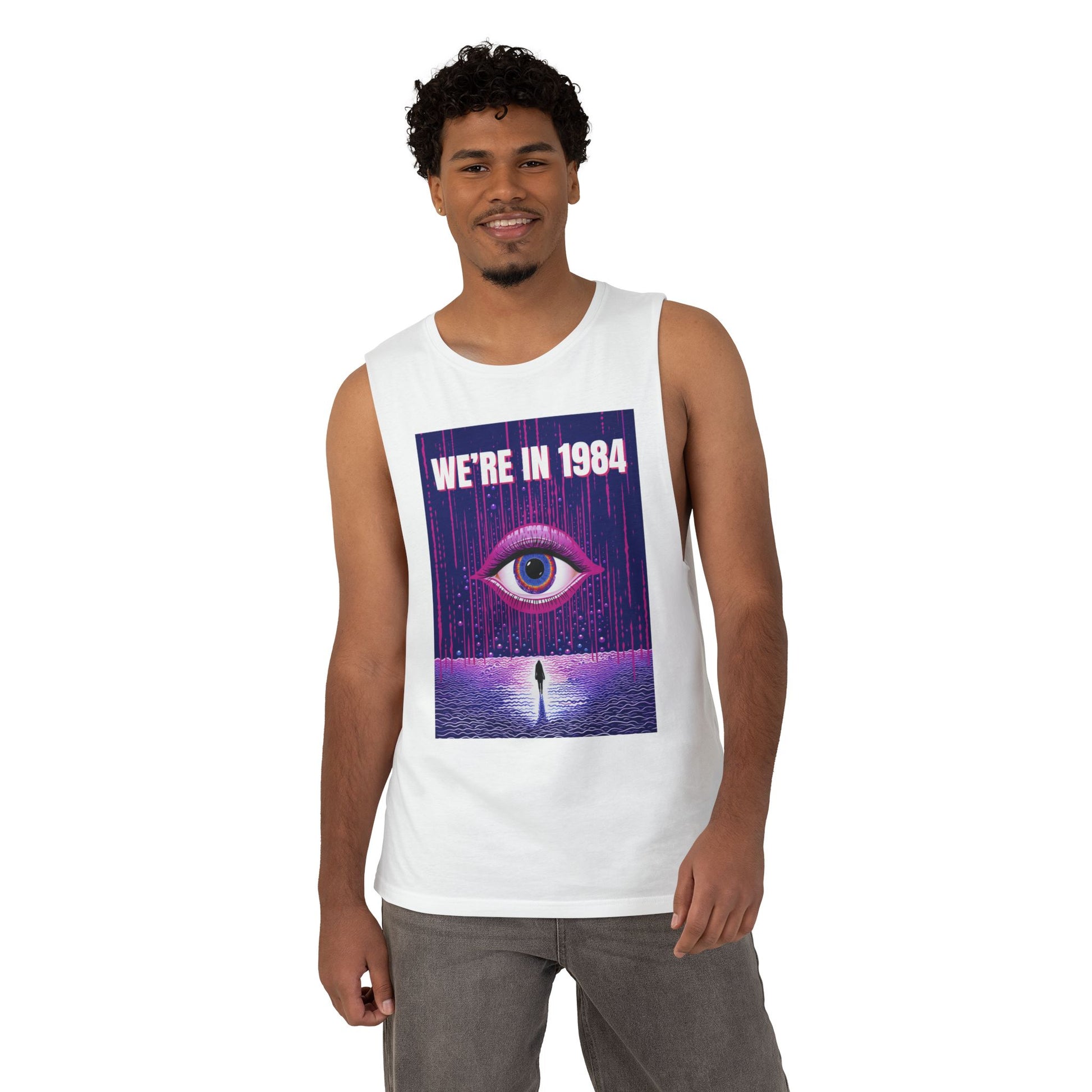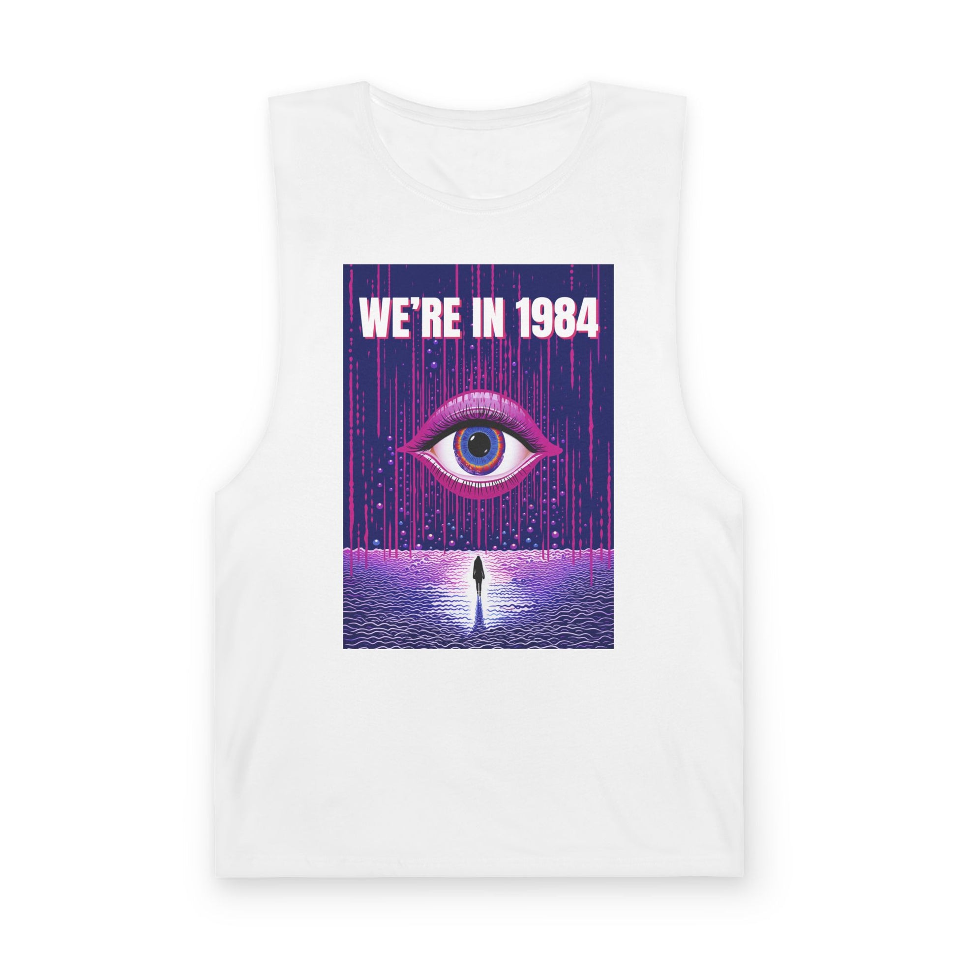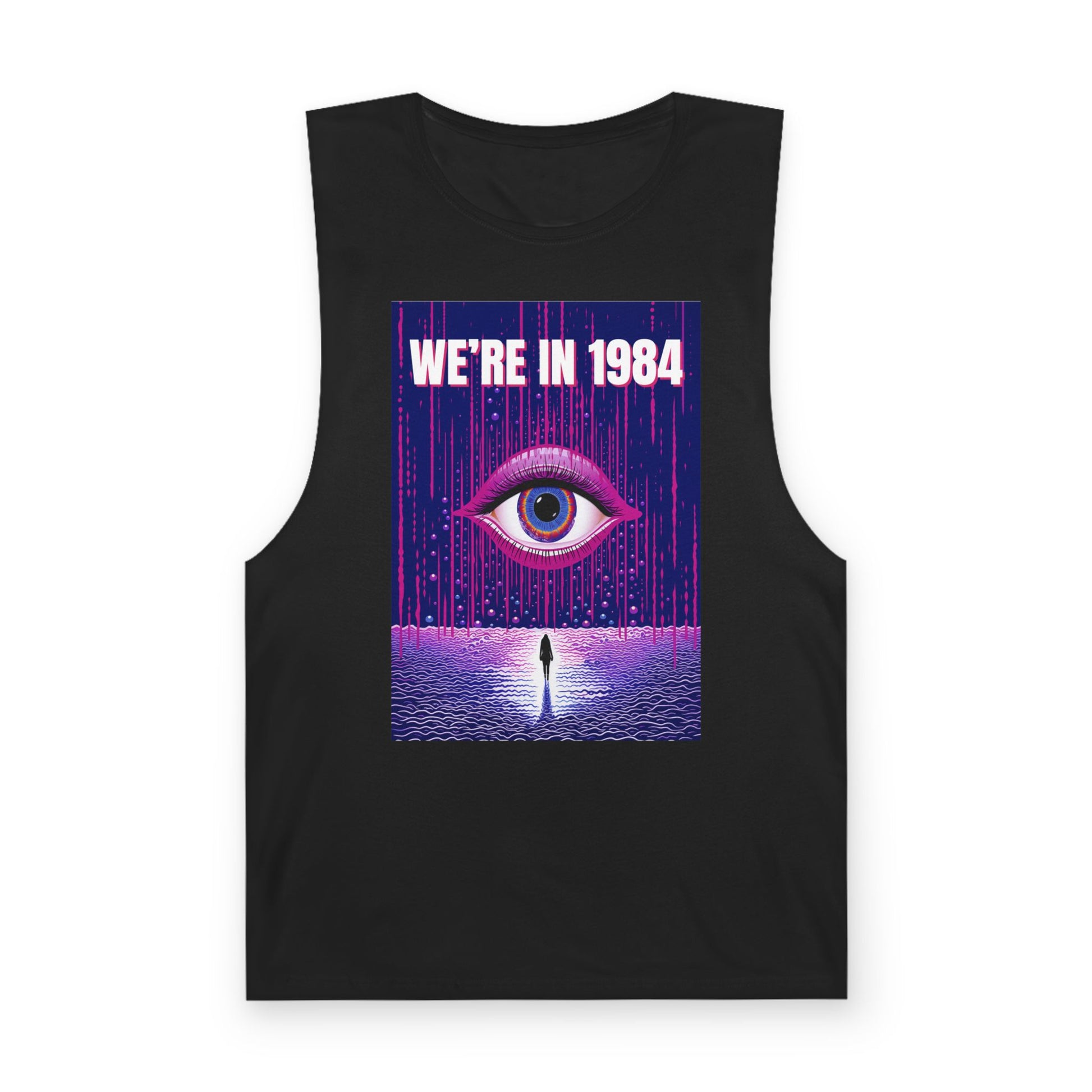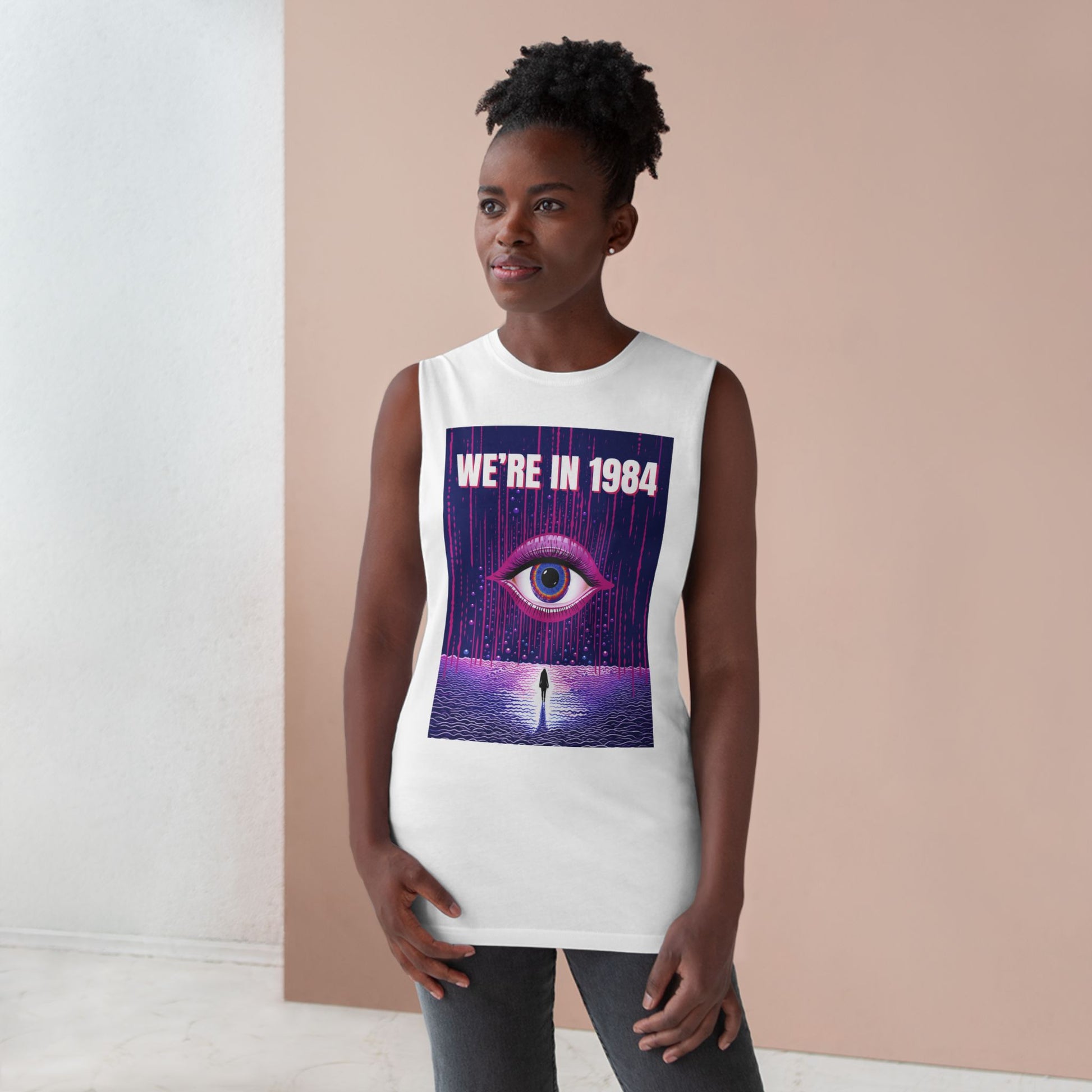 A lightweight tank that wears like a statement. This sleeveless top pairs a sleepless, neon-drenched graphic — a single watchful eye above a lone figure with the words “WE’RE IN 1984” — with an airy, soft hand. The raw-cut armholes and sleeved edges give it a lived-in, DIY attitude that reads as rebellious rather than polished. It layers easily under an open flannel or stands alone at a late-night show, letting the bold, retro-futuristic art do the talking while you move comfortably through warm evenings and crowded venues.